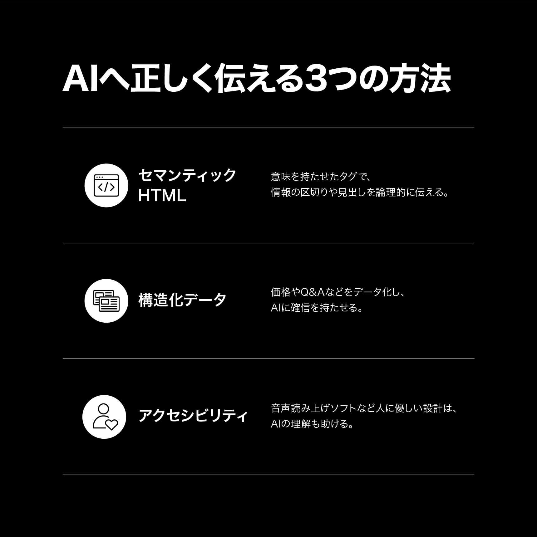 「目の不自由な方が利用するスクリーンリーダー(音声読み上げソフト)」にとって親切なホームページは、AIにとっても理解しやすいホームページになります。